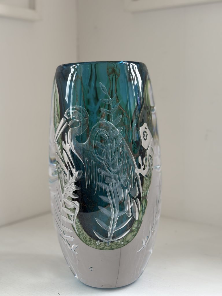 Genom den avancerade dubbelarieltekniken skapar Micke djup och transparens i flera skikt, där luft och ljus bygger upp en värld inuti glaset. Resultatet är ett konstglas som både berättar och andas – en poetisk hyllning till naturens stilla dramatik.