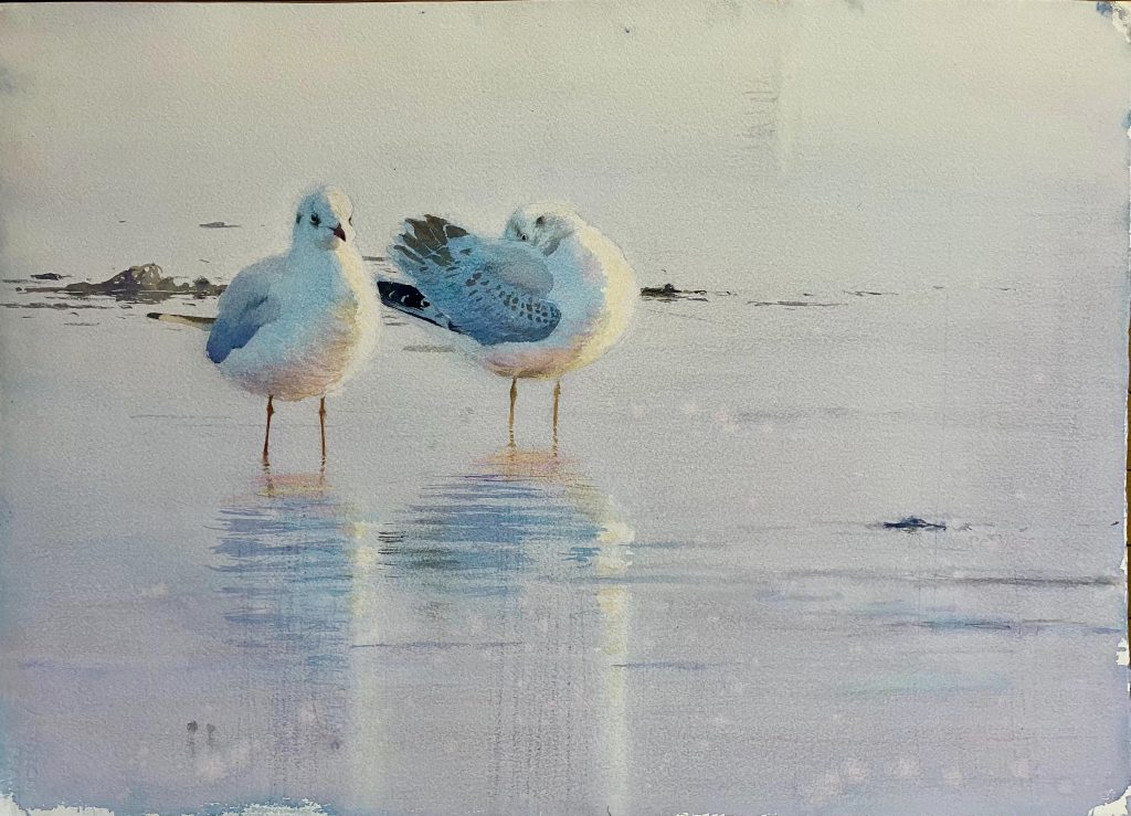 Två måsar står vid vattenlinjen, fångade i en ögonblicklig balans mellan rörelse och vila. Ljuset löser upp konturerna, färgerna andas hav och luft.